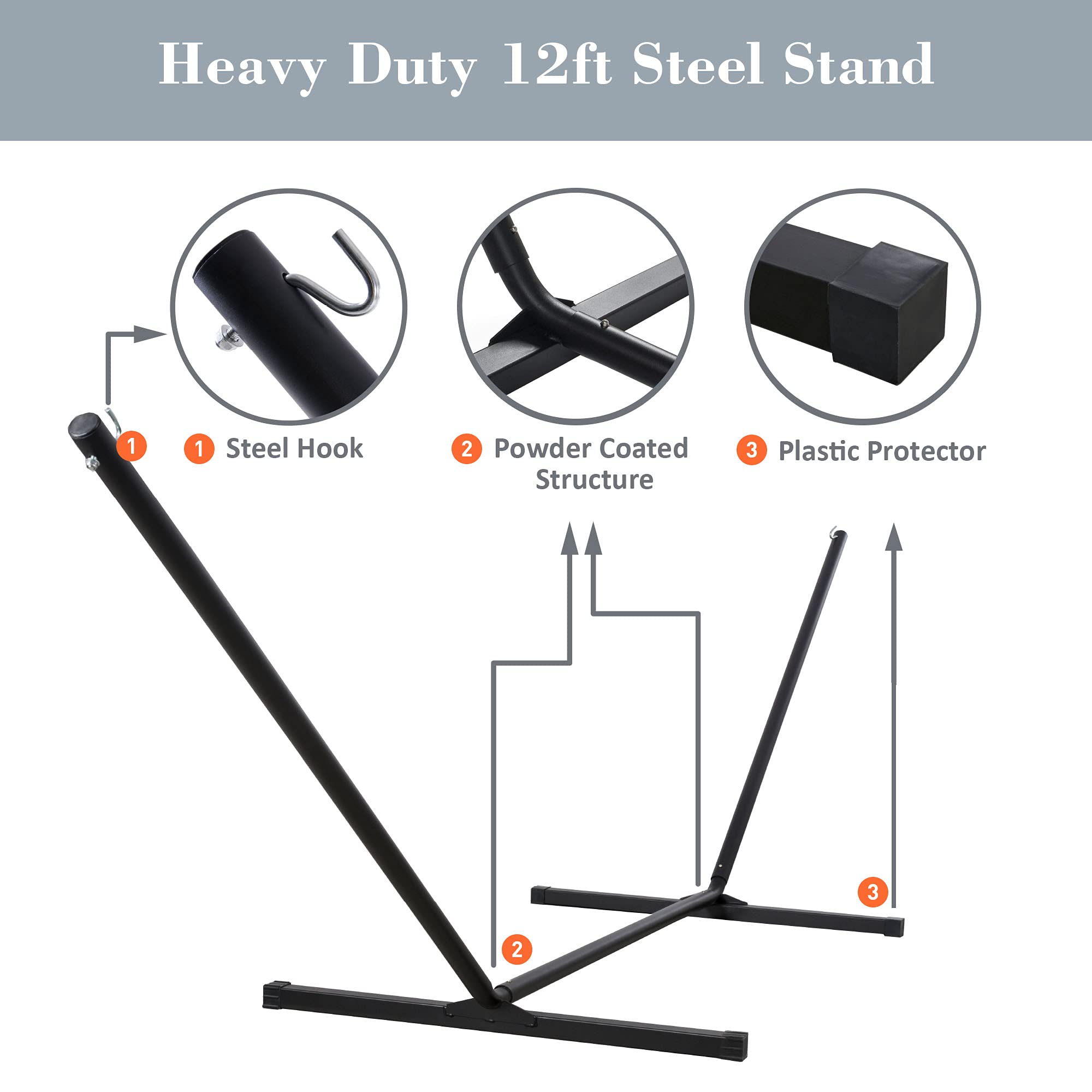 - Freestanding Hammock with Portable Stand: No damage to trees. Created to be stable and long-lasting, the 12 ft stand is made from powder-coated heavy gauge steel. It can be easily assembled in minutes without any tools, and it could be disassembled easily. Feel free to contact us if you have any questions during use within one year of purchase. We are always here to help